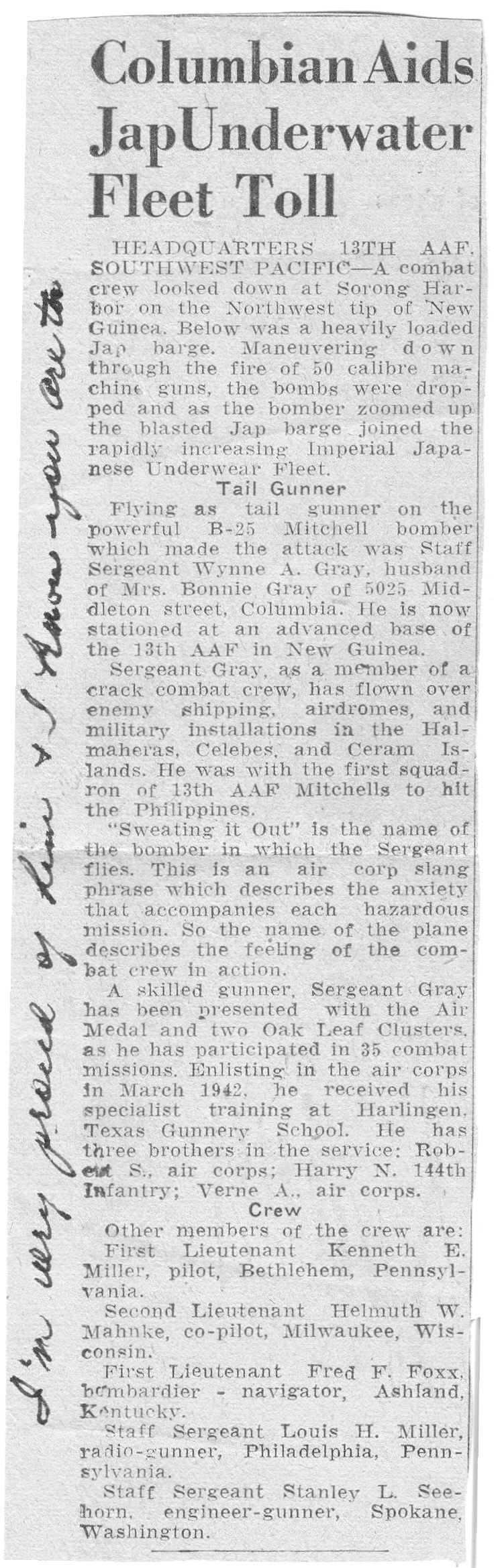 The newspaper clipping came from a scrapbook kept by Wayne’s mother. I believe the clipping was sent to her by Wayne’s wife.